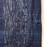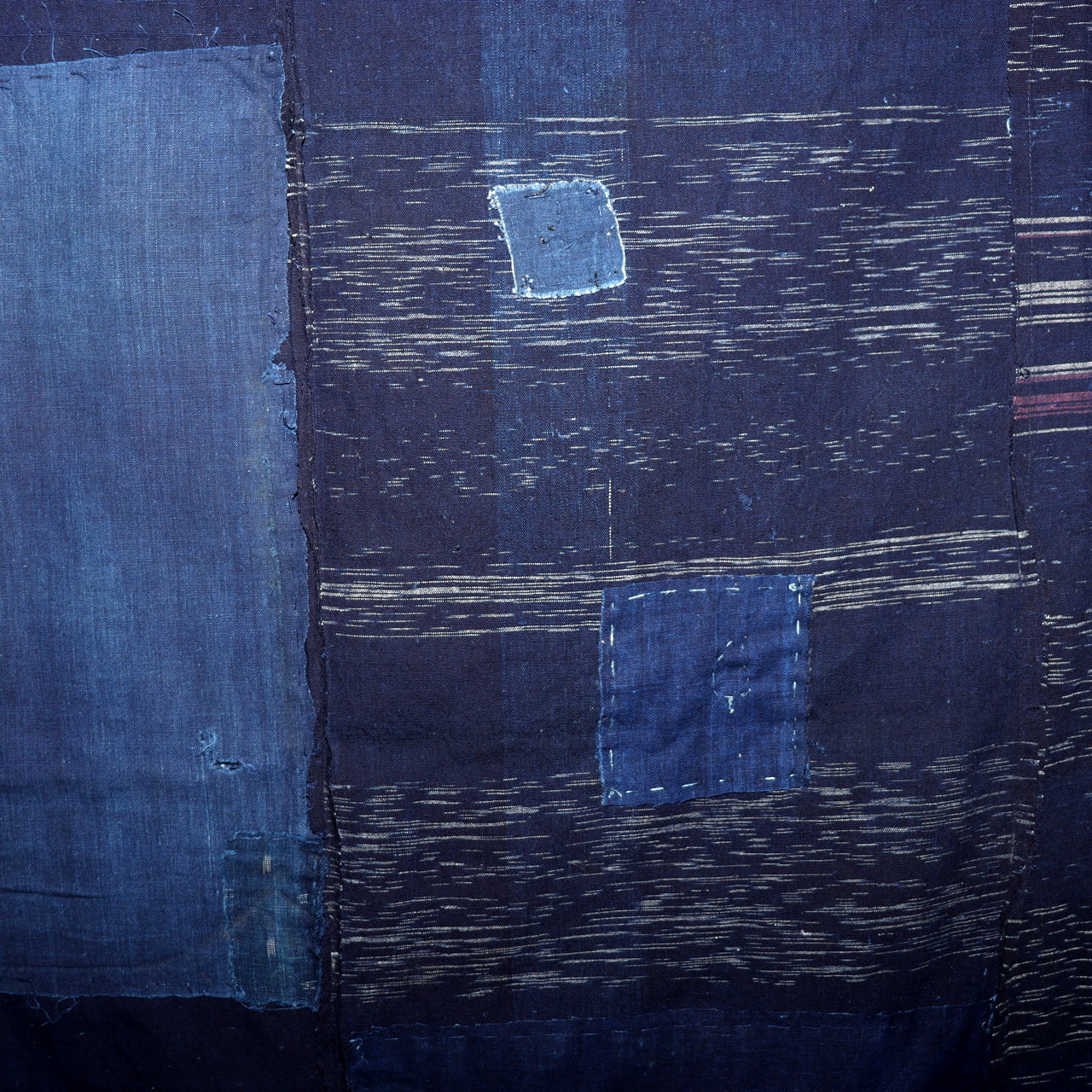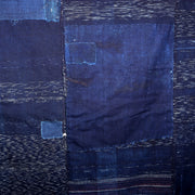 Style: "Boro". The textile features a rustic texture with white flecks (Kasuri style) and includes historical patchwork repairs using various shades of indigo fabric.